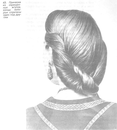 Представить длинные волосы в выгодном свете можно эффектным и в то же время сравнительно простым вариантом укладки, показанным на рис. 43.